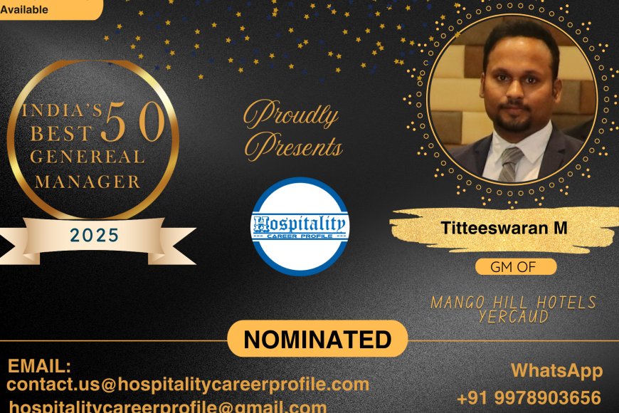 Titteeswaran M, GM of Mango Hill Hotels Yercaud, has been nominated for India’s 50 Best General Managers 2025. A leader in luxury hospitality, business growth, and guest service excellence.